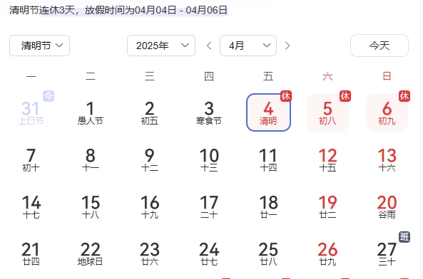 根據(jù)國家2025年春節(jié)放假通知并結合本司實際情況,放假做以下調(diào)整:1、放假時間:2025年4月4日至2025年4月6號,共3天,3月7號正常上···